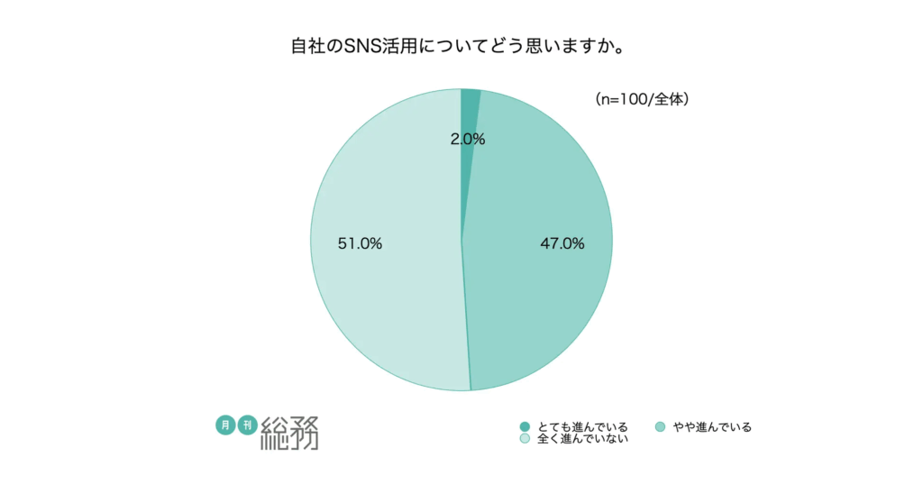 またその一方で「自社のSNS活用についてどう思いますか」という問いに、「全く進んでいない」と回答した人が51人いることも分かりました。