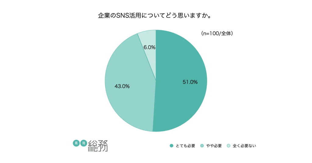 2022年、株式会社月刊総務が行った全国の企業の総務担当者100人に向けたアンケート調査によると「企業のSNS活用についてどう思いますか」という質問に対し、「とても必要・やや必要」と回答した人が、合計で94人いたことが分かりました。